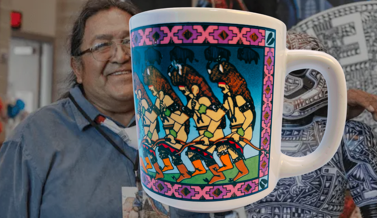 This mug features artwork by Rod Velarde, a Jicarilla Apache artist known for capturing cultural stories through bold visual design. His work often reflects ceremonial life, movement, and tradition. Because of that, each piece carries deeper meaning beyond the surface.