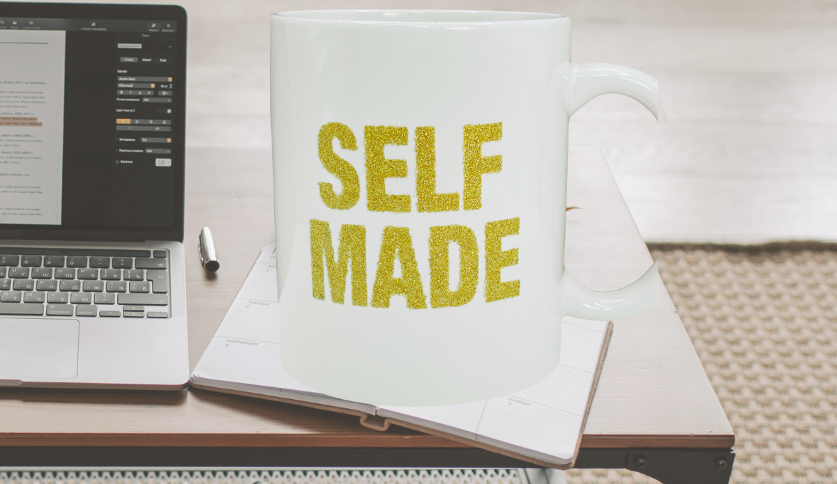 - Bold “SELF MADE” text in textured gold glitter-style lettering