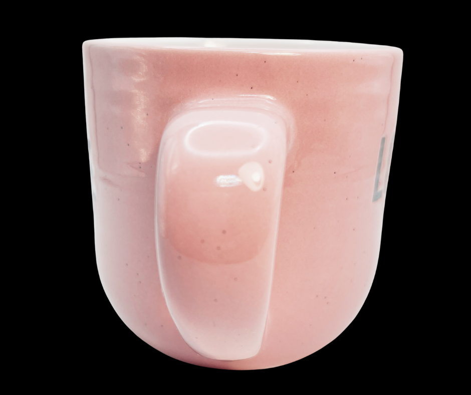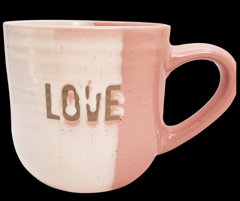 It has a two-tone pink and white design with a speckled finish and the word “LOVE” printed in soft grey lettering.
