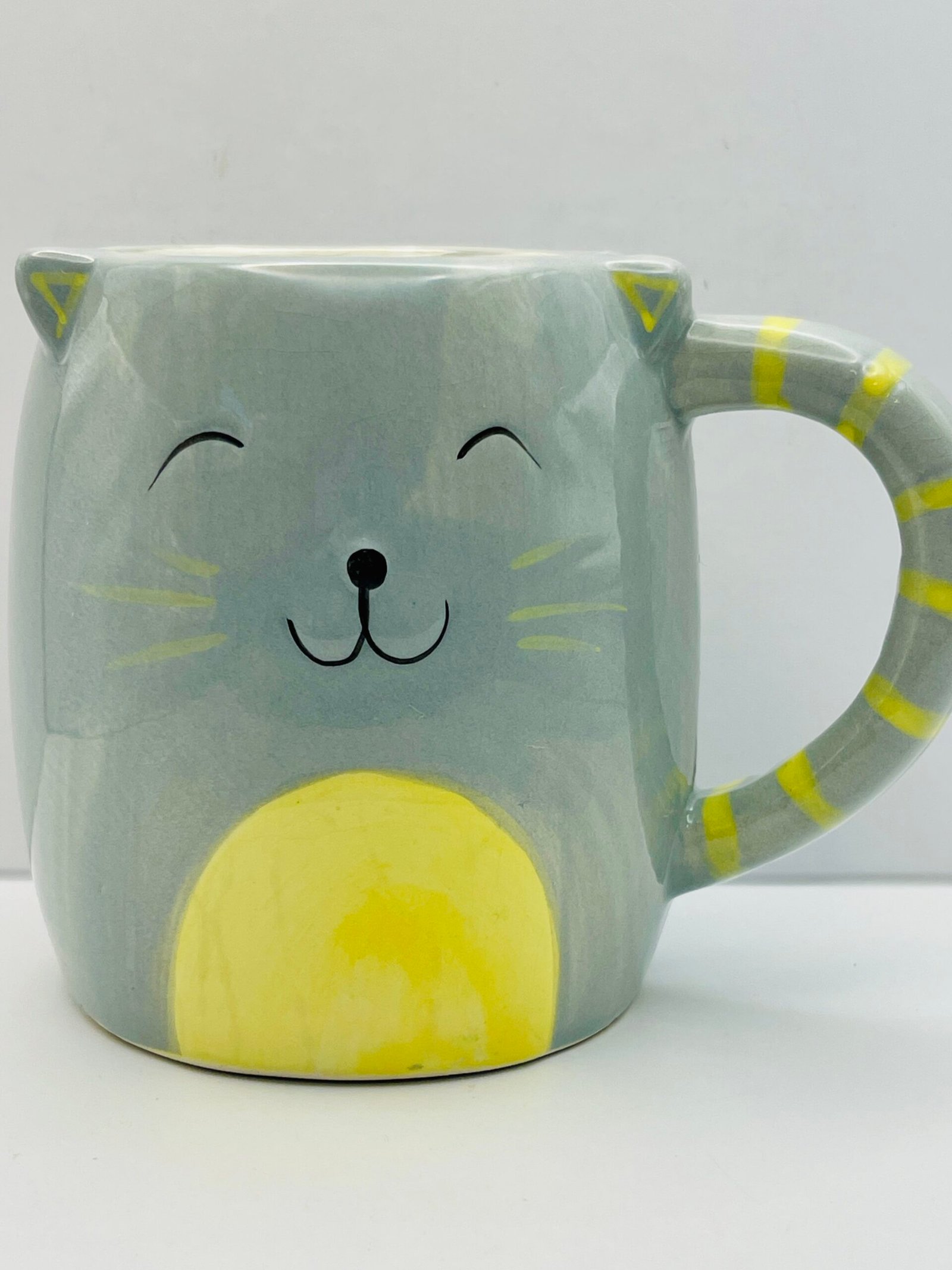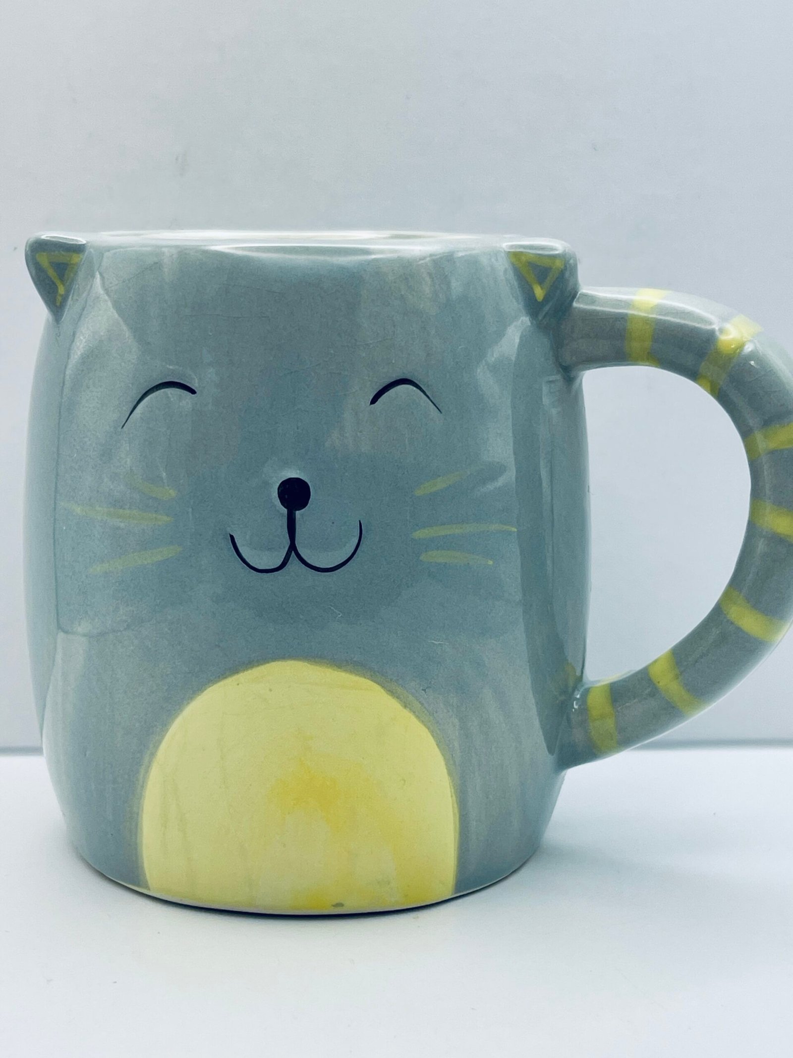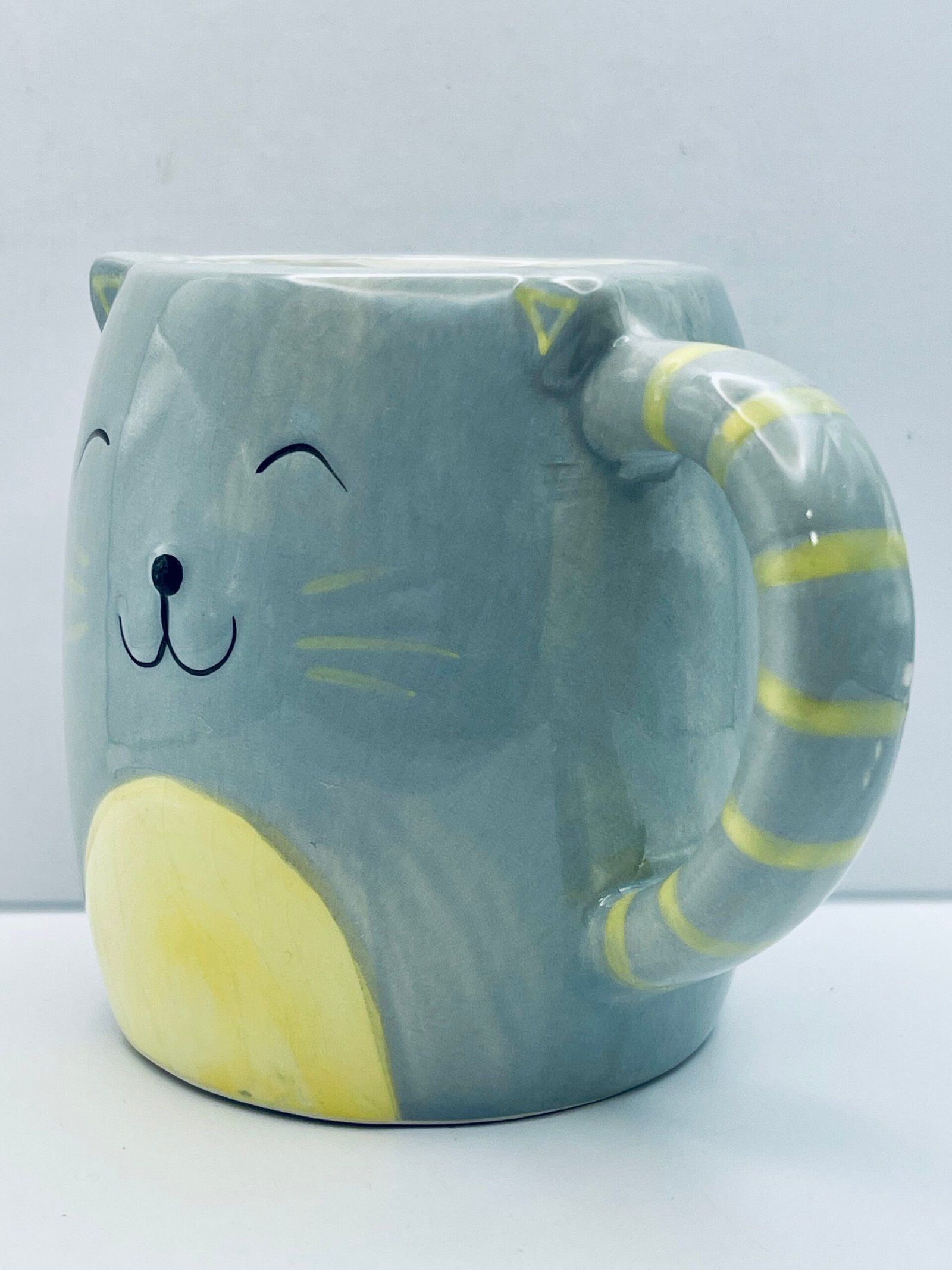 In fact start your day with whimsy using the Smiling Cat Face Ceramic Mug. This adorable 10-ounce mug features a cute gray cat face with pointy ears along the rim. And a striped tail forming the handle. Yellow accents on the belly and handle stripes make the Smiling Cat Face Ceramic Mug a playful and cheerful addition to your drinkware collection.