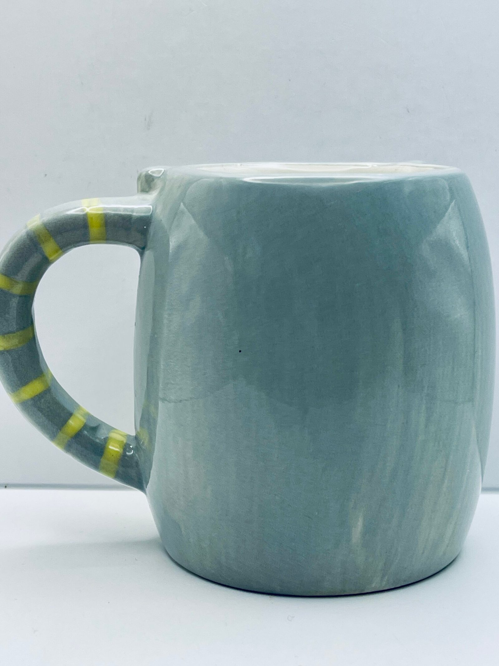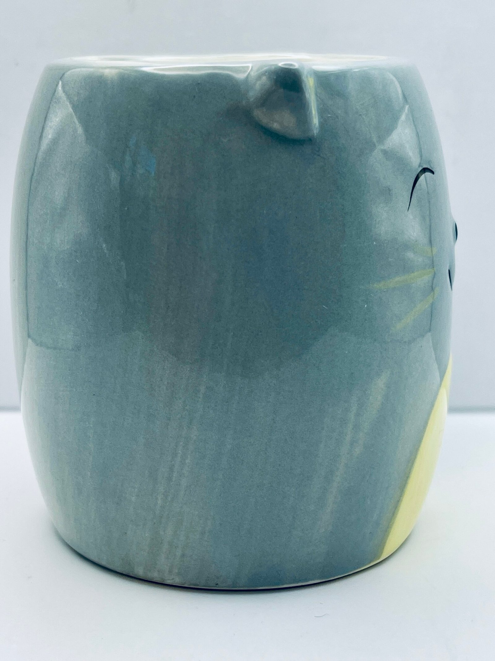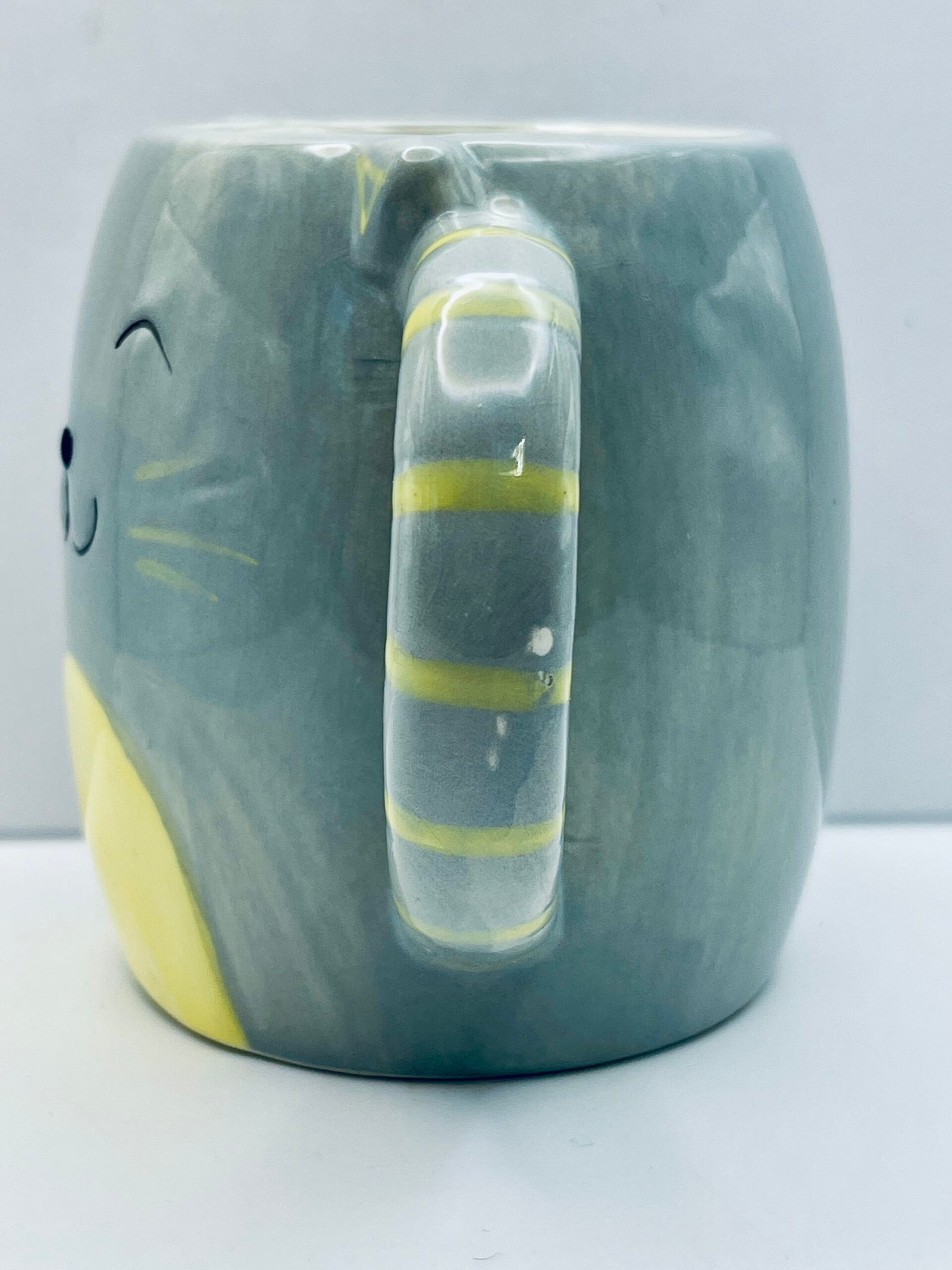 In fact start your day with whimsy using the Smiling Cat Face Ceramic Mug. This adorable 10-ounce mug features a cute gray cat face with pointy ears along the rim. And a striped tail forming the handle. Yellow accents on the belly and handle stripes make the Smiling Cat Face Ceramic Mug a playful and cheerful addition to your drinkware collection.