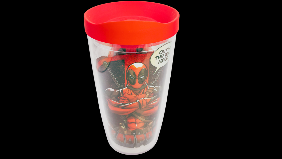 This tumbler features a bold wraparound Deadpool illustration sealed within the insulated walls of the cup.