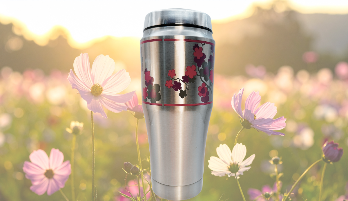 Results show floral stainless steel mugs exist. At the same time, this exact pattern placement and color balance are not widely matched. That positions this piece as a CupofMood-exclusive find with strong visual identity.