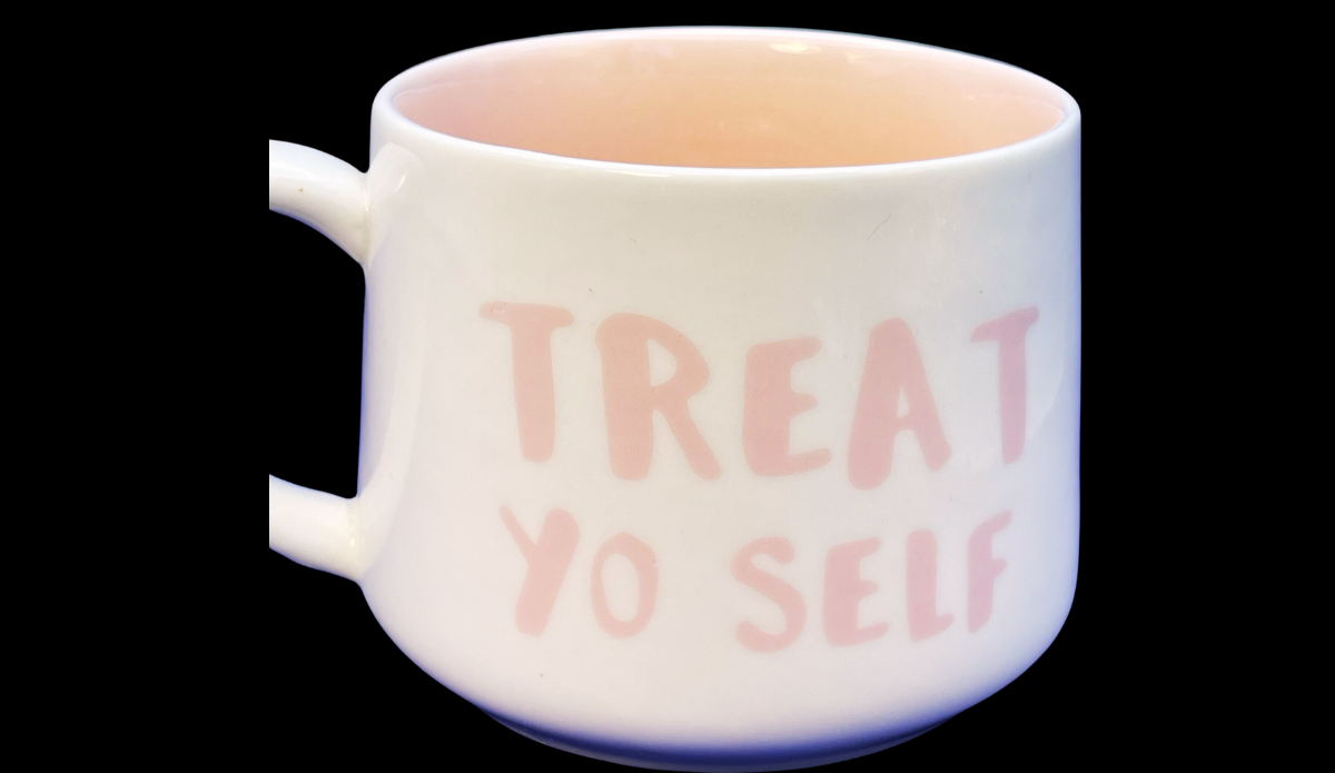 The Treat Yo Self phrase taps into self-care culture. At the same time, the soft pink lettering keeps the tone calm rather than loud. Therefore, it appeals to both expressive and cozy aesthetics.
