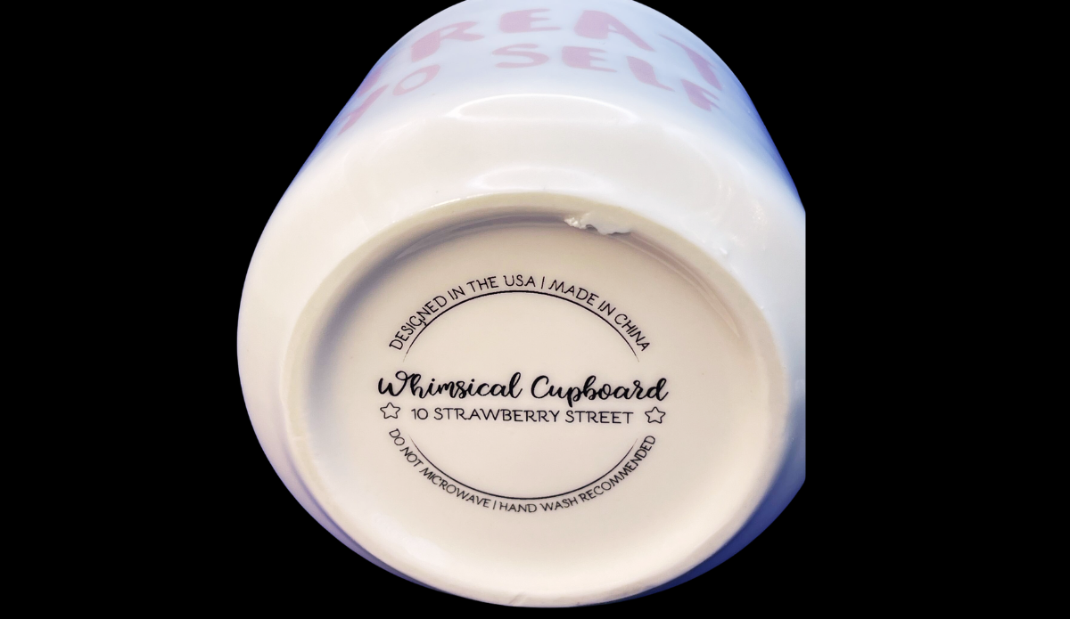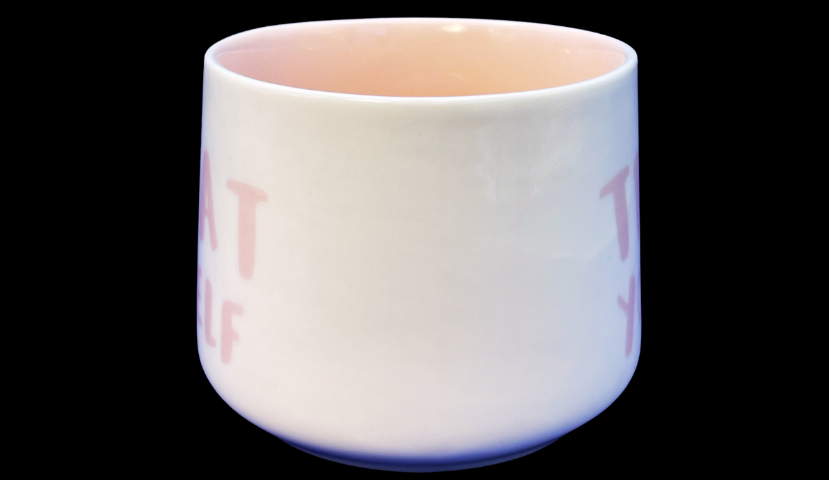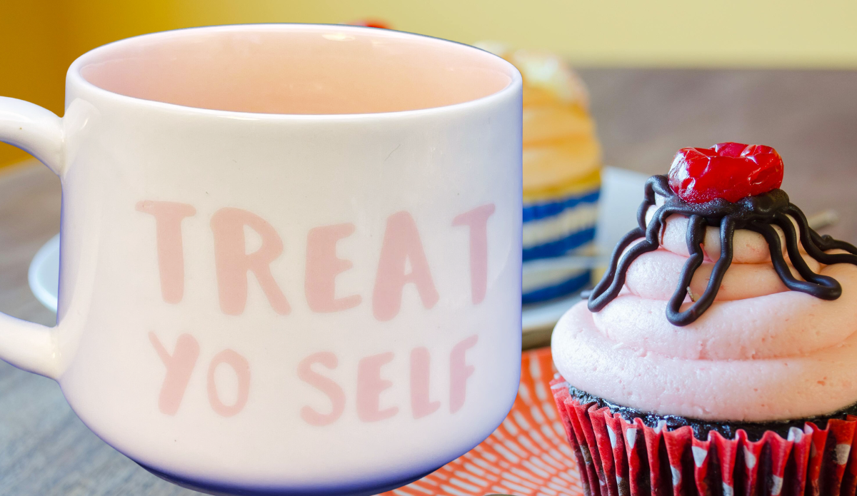 This ceramic mug features a smooth white exterior with soft pink lettering that reads treat yo self. Meanwhile, the rounded shape gives it a cozy, comforting feel. Inside, a hidden cupcake detail adds a playful surprise.