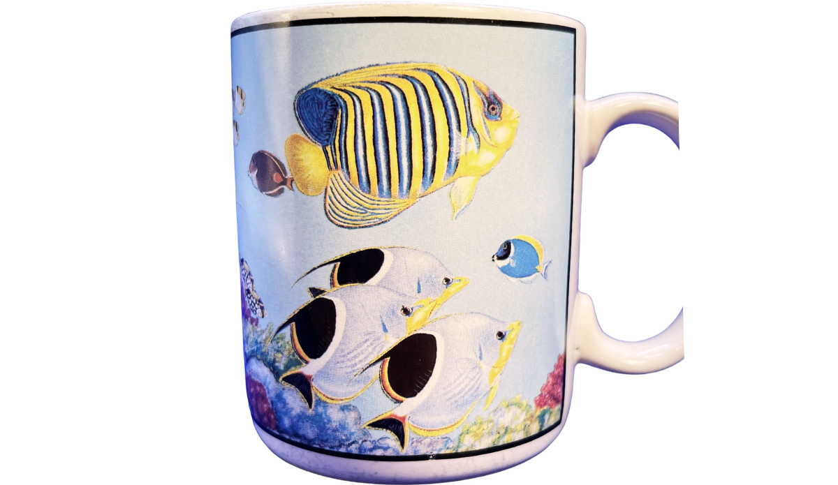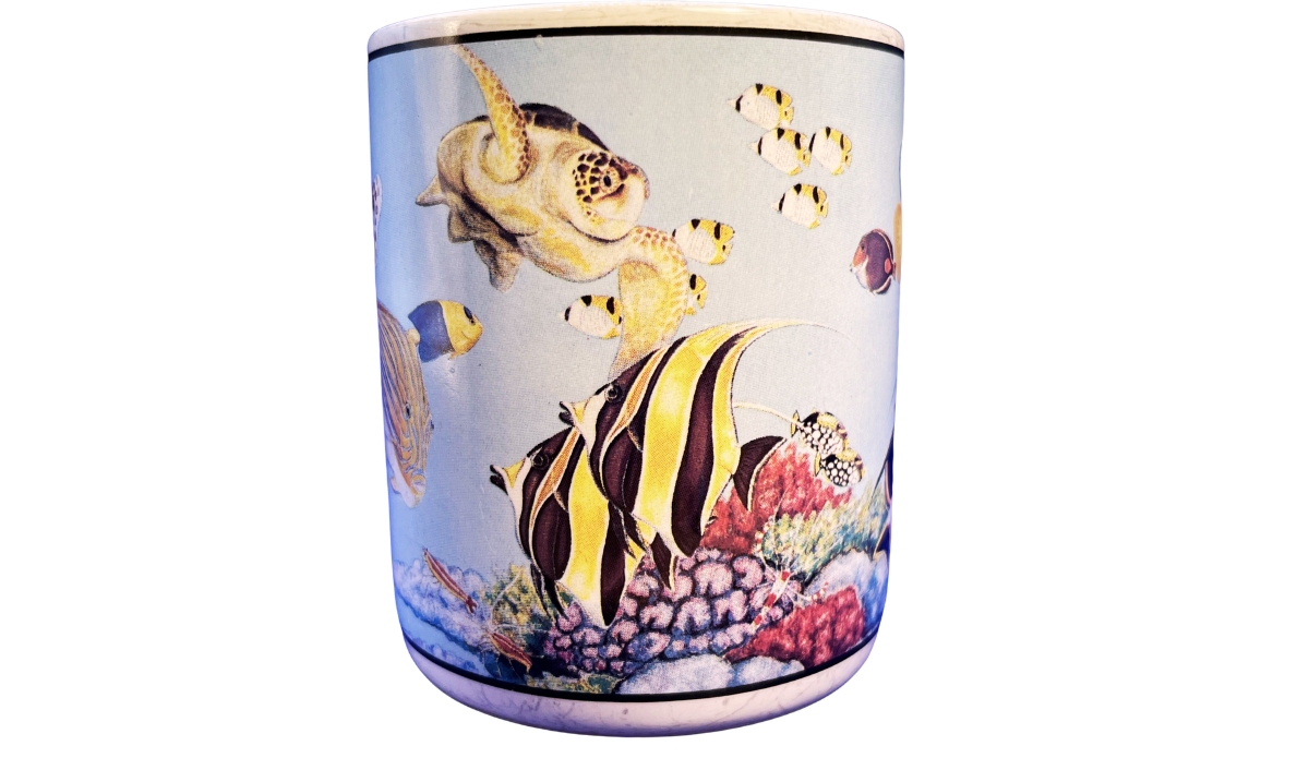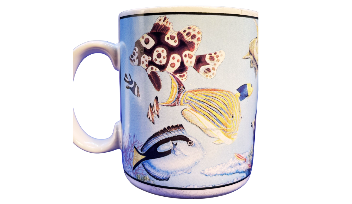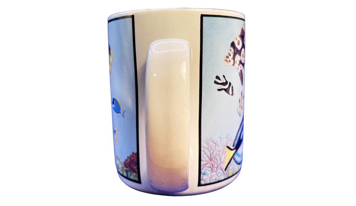 As you turn the mug, more sea life comes into view. Different fish appear across the wraparound panels. Because of that, each angle gives you a fuller look at the underwater scene.