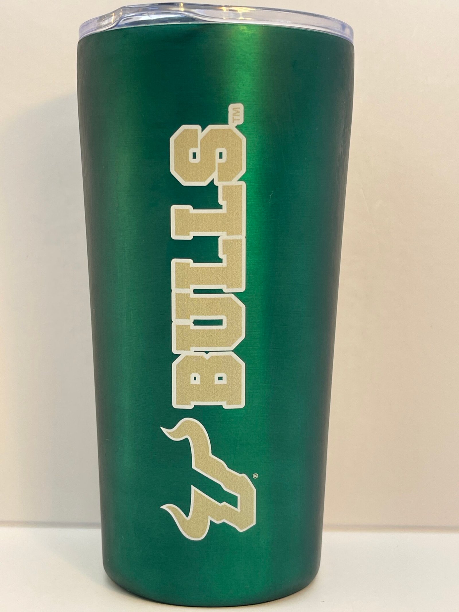 In fact featuring a sleek deep green matte finish and striking gold graphics of the iconic USF Bulls mascot. Right alongside the word “Bulls” in big, proud letters. This tumbler is the ultimate accessory for students, alumni, and die-hard fans alike.