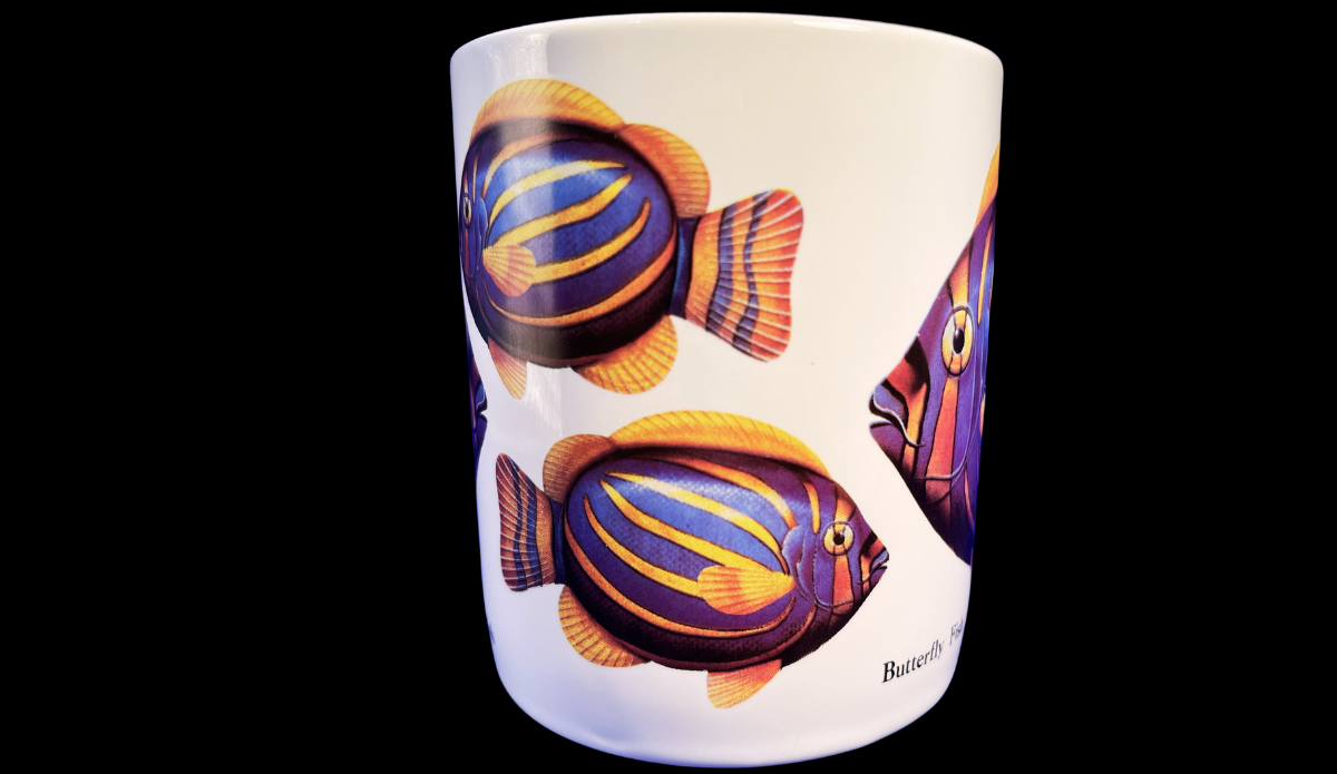 The design highlights a butterfly fish in bold, tropical colors. Because of that, the mug feels bright and full of energy. As you turn the mug, the artwork continues naturally across the surface.