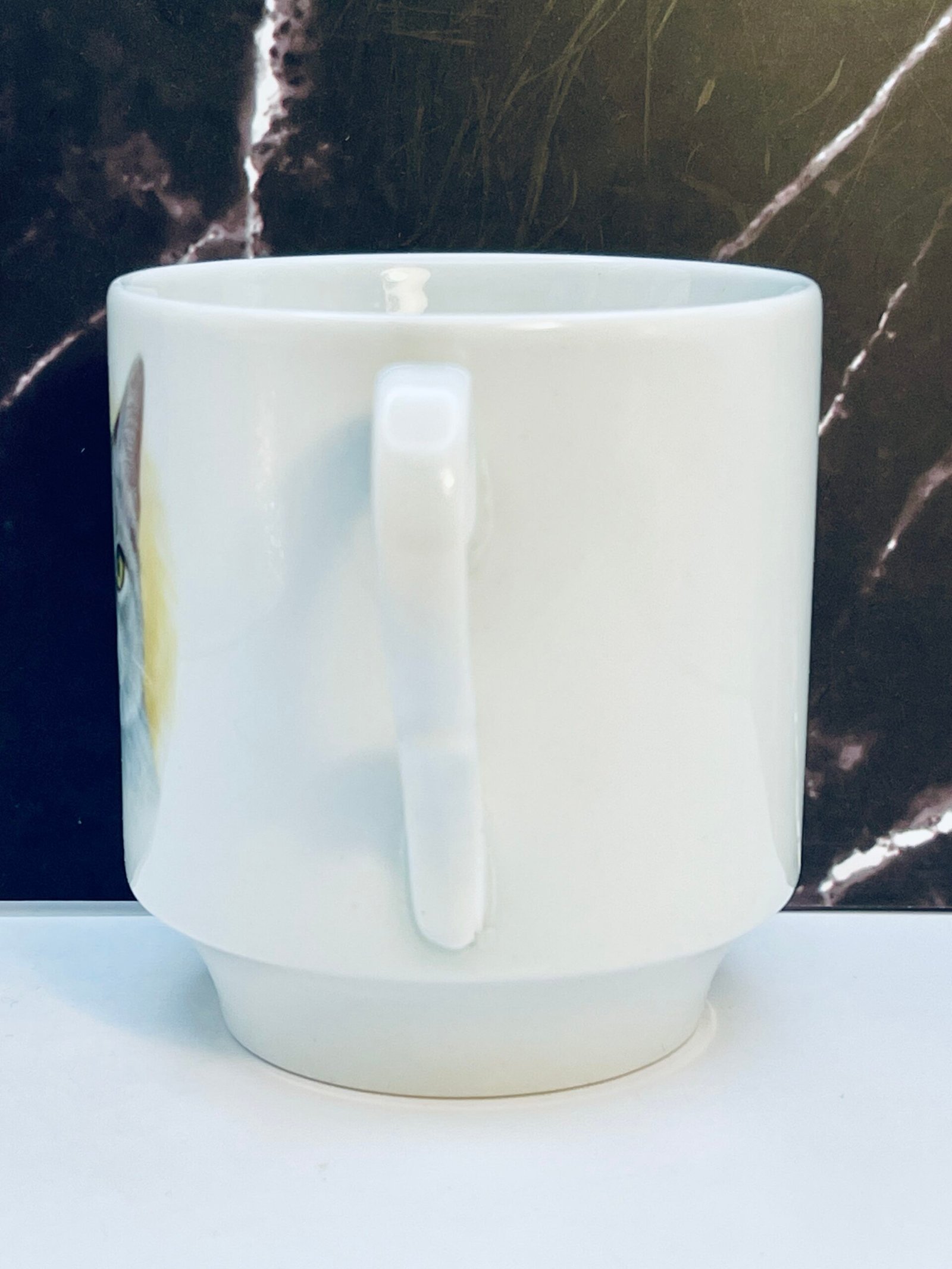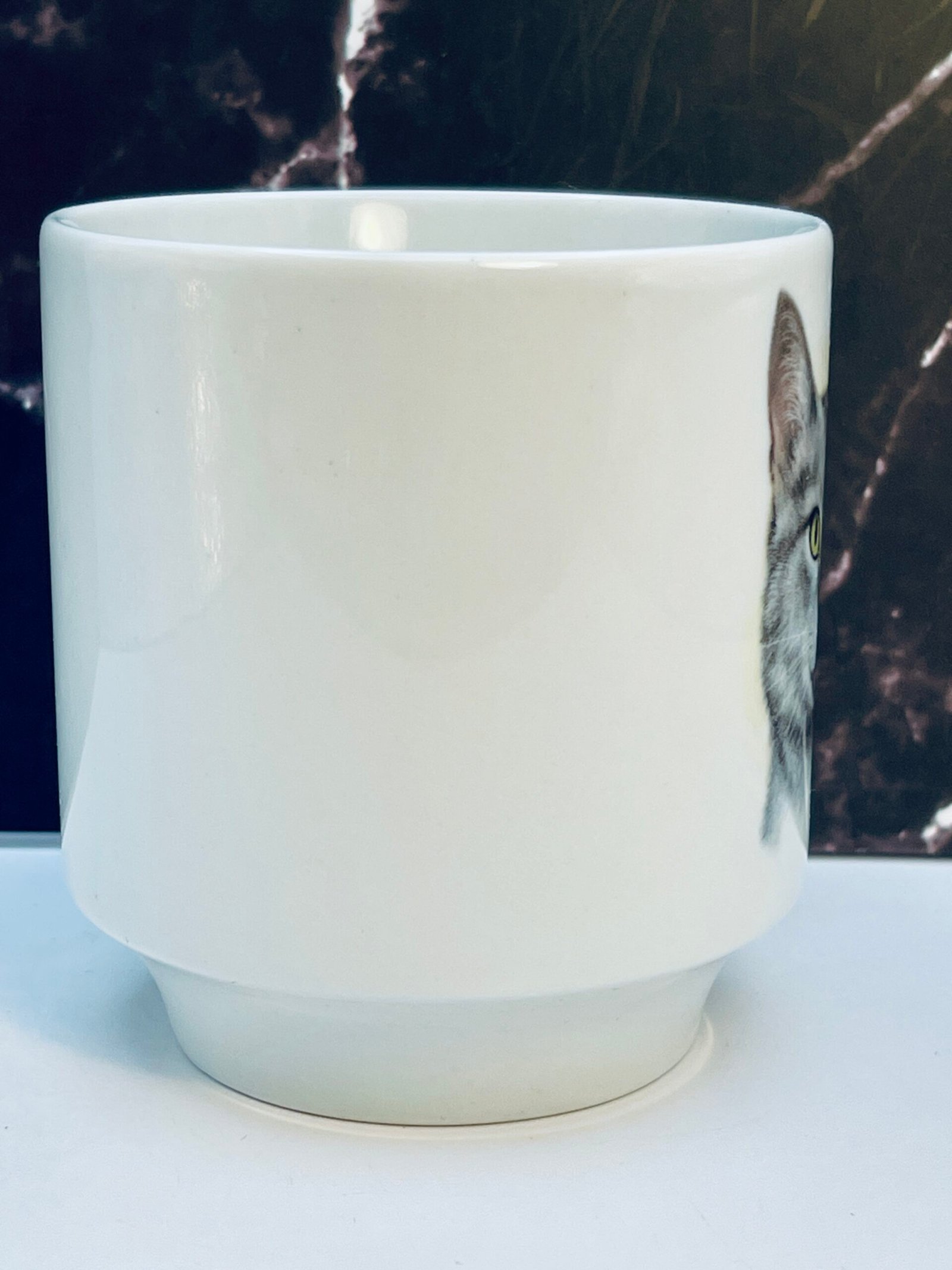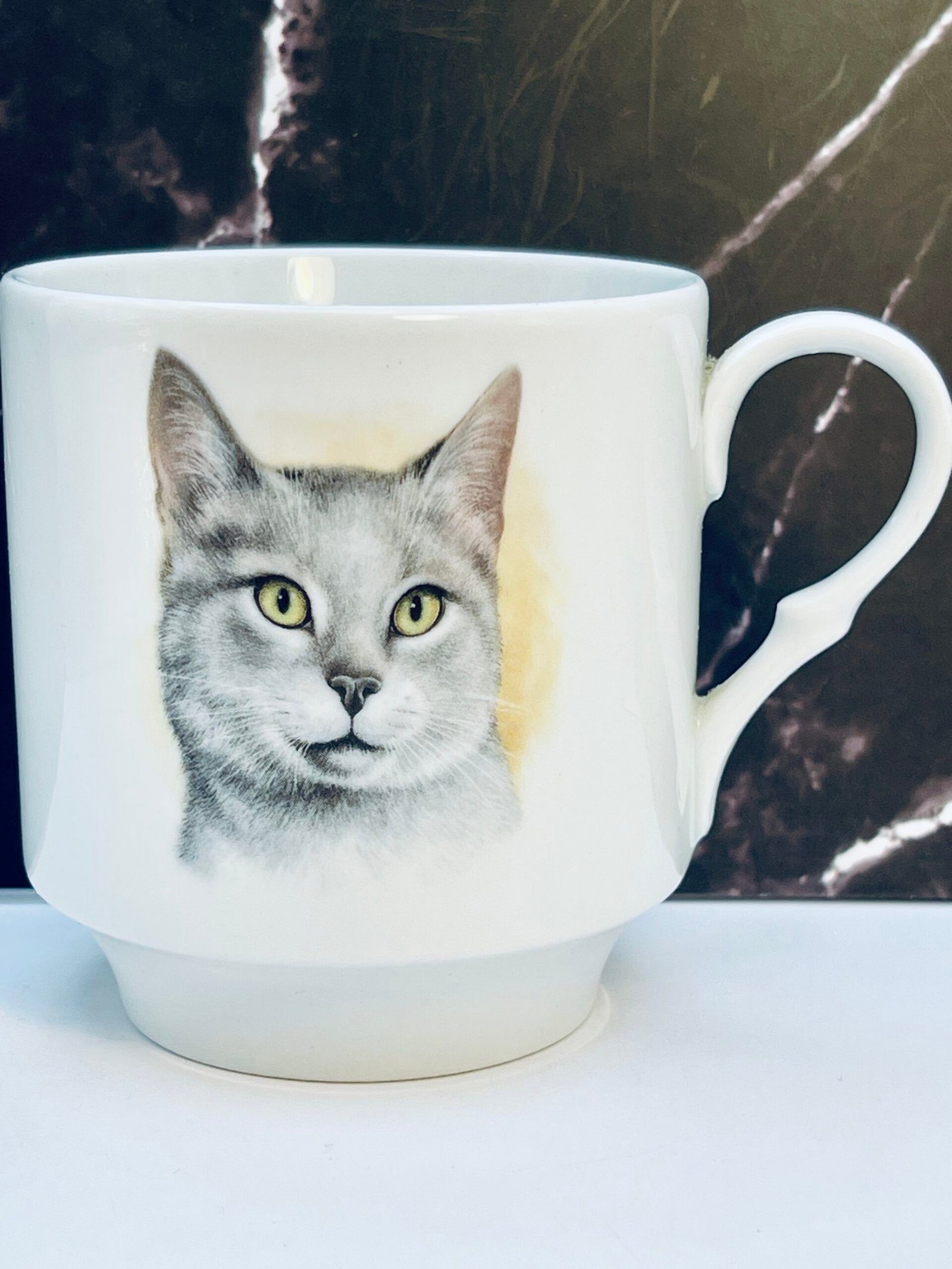 Indeed you’re sure to enjoy timeless elegance with the Vintage Schumann Arzberg Cat Mug. This 8-ounce porcelain mug showcases a beautifully detailed gray cat portrait on the front. Especially making it a must-have for cat lovers and collectors.