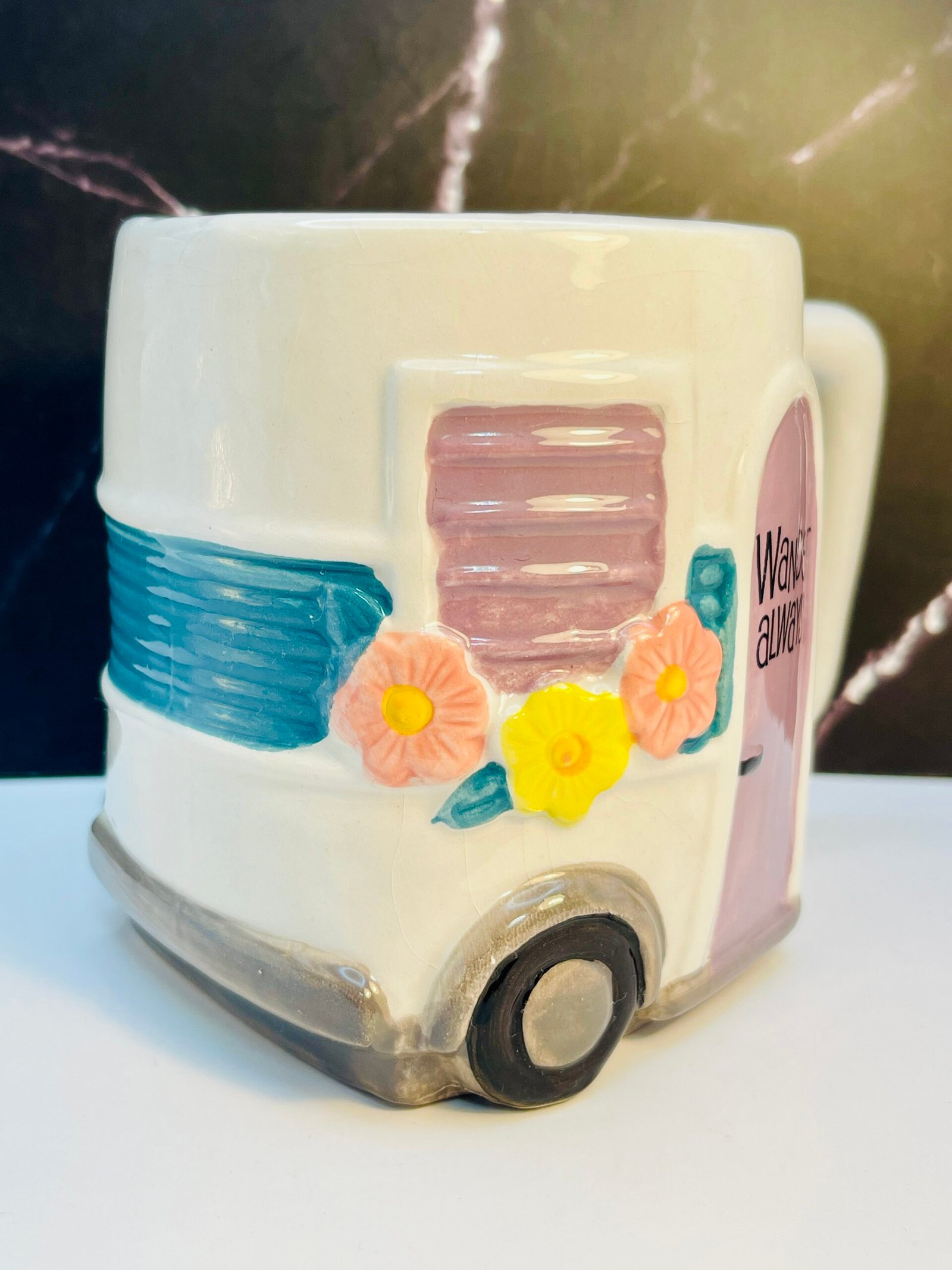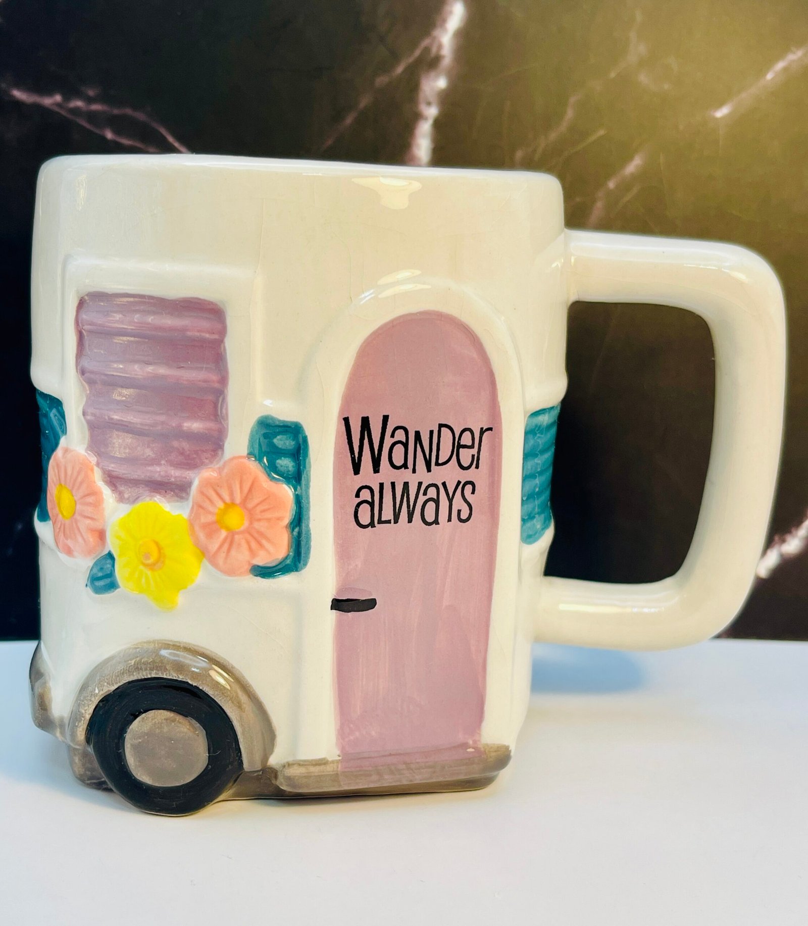 This Wander Always Camper Mug is made by Boston Warehouse and crafted from ceramic. It features a retro travel trailer shape decorated with floral designs, giving it a nostalgic, road-trip-ready feel.