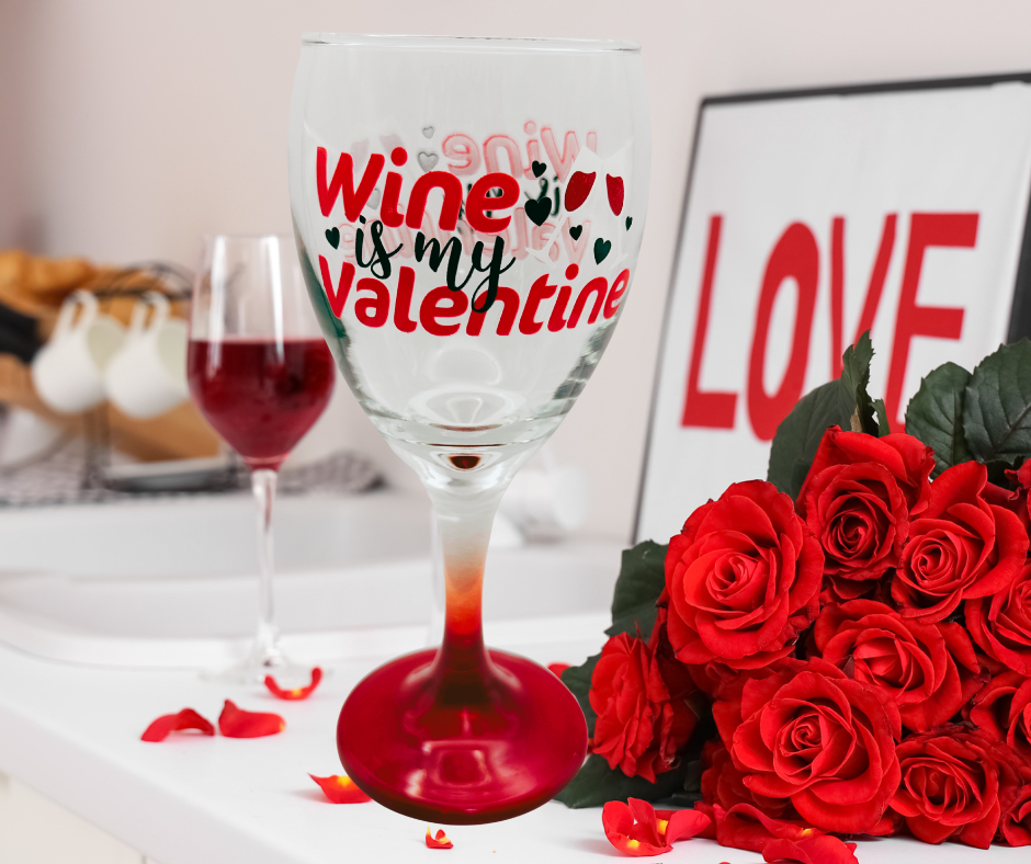 Because the phrase “Wine Is My Valentine” is paired with heart details and a bold red stem, the message feels expressive and instantly inviting.