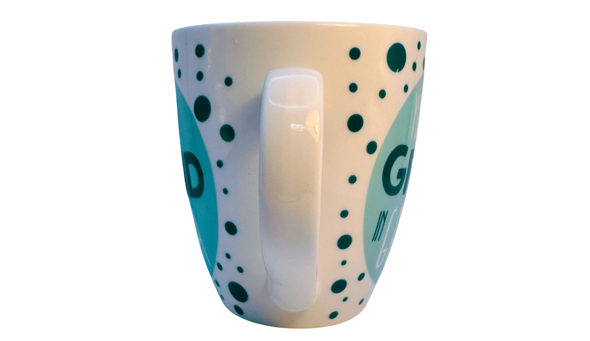 This mug works beautifully for both everyday use and display. Meanwhile, the teal color palette and playful polka dots give it a bright visual presence.