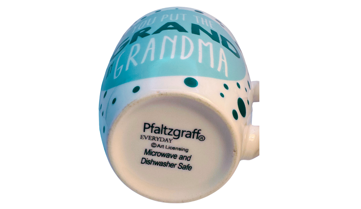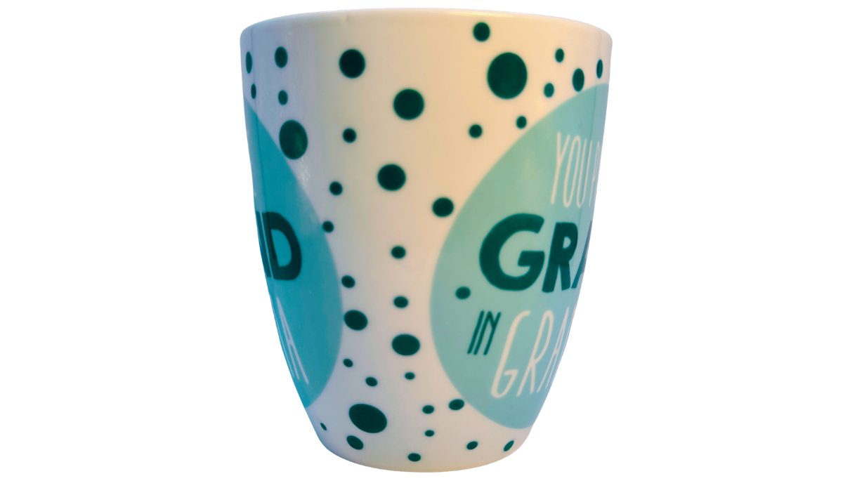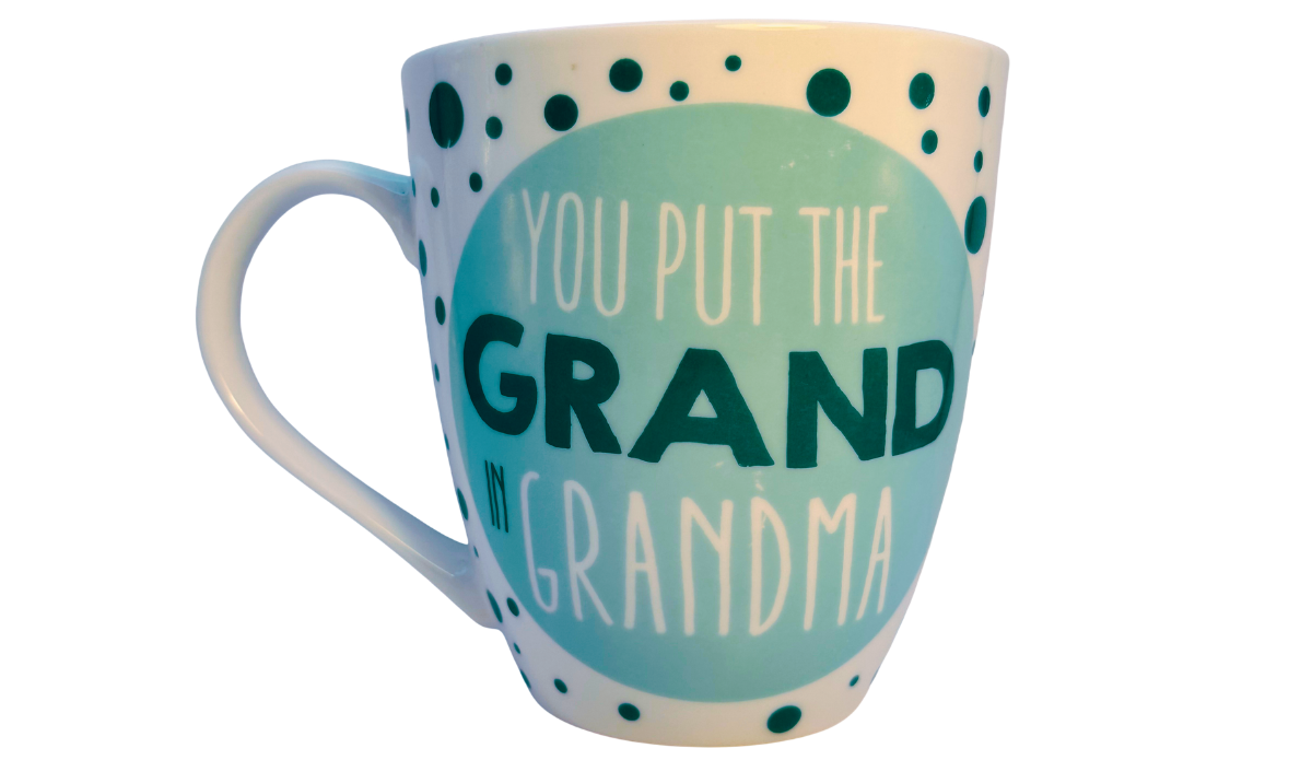 This stoneware mug features a white base with teal polka dots and a large teal circle showcasing the phrase “You Put The Grand In Grandma.”
